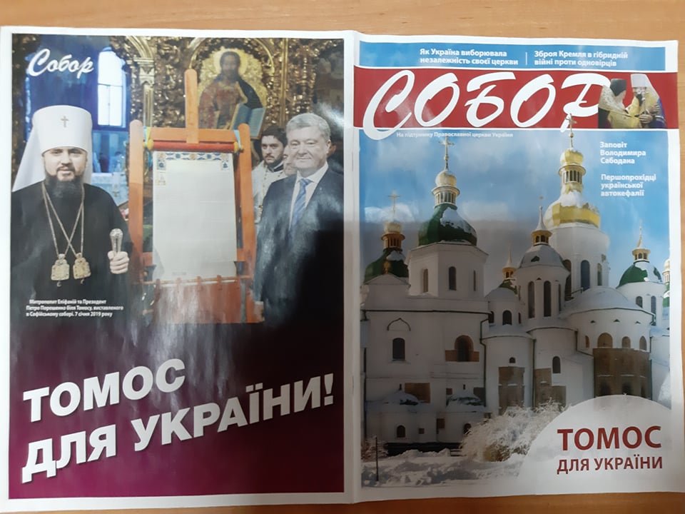 Слід відзначити, що в агітаційних наметах на користь кандидата Петра Порошенка перехожим у лютому роздавали журнал «Собор», який формально не є агітаційним матеріалом, на ньому є позначка – «На підтримку Православної церкви України». Втім у журналі є візуальні картинки із гаслами «Цей день увійшов в історію!», «Томос для України!» – схожі на ті, які були на білбордах з іменем Петра Порошенка до моменту його реєстрації як кандидата. Журнал фактично не містить вихідних даних, зокрема – інформацію про тираж та установу, що здійснила друк. Єдине, що вказано – це імена головного та художнього редакторів.
