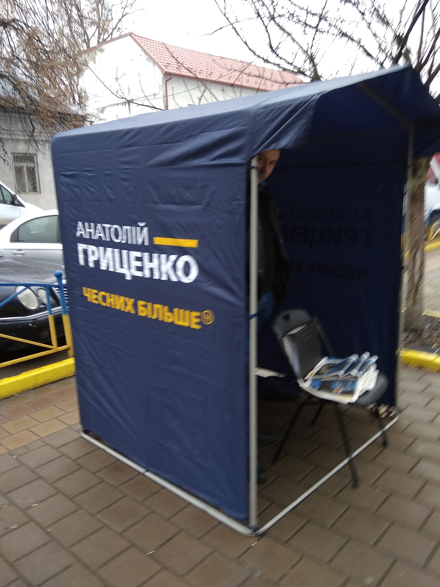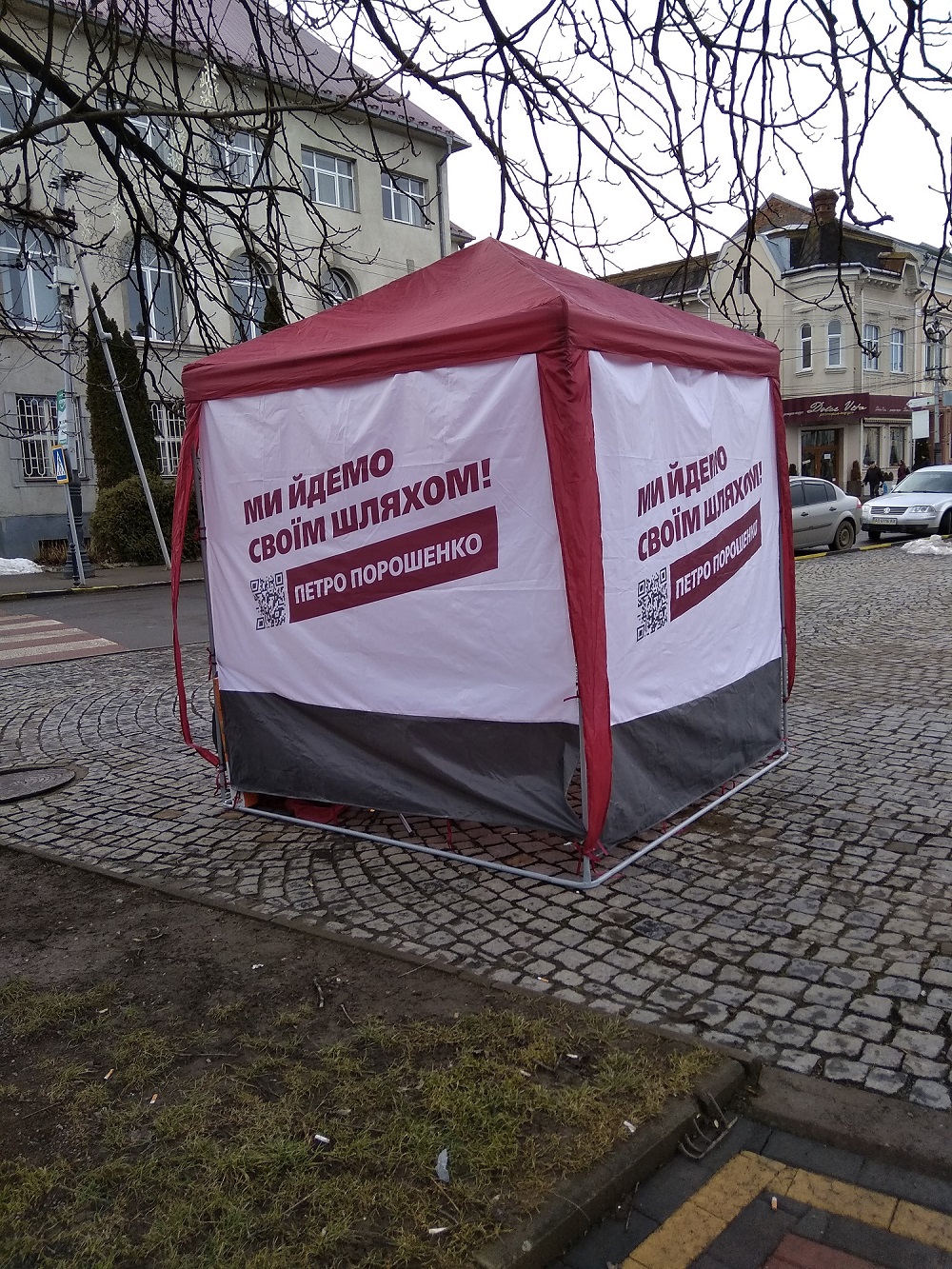 На вулицях Ужгорода та інших міст області ОПОРА зафіксувала роботу агітаційних наметів від кандидатів Петра Порошенка (намети почали роботу із середини лютого, до того їх не було), кандидатки Юлії Тимошенко, Валентина Наливайченка, Андрія Садового, Олега Ляшка Анатолія Гриценка, Олександра Шевченка, Руслана Кошулинського.