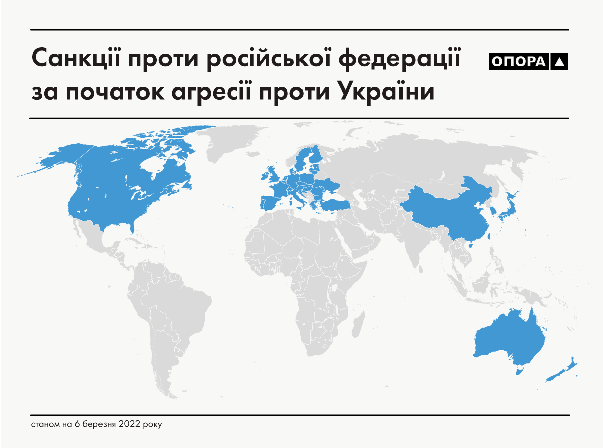 Вже одинадцять днів українські збройні сили мужньо тримають оборону проти російських загарбників. Однак варто розуміти, що сьогодні Україні було би значно складніше боротися з Російською Федерацією, якби не економічні, політичні та психологічні способи тиску на агресора з боку світової спільноти. ОПОРА підготувала два матеріали про те, як світ та окремі компанії й корпорації борються з російським вторгненням до України. У цьому матеріалі розповімо, як проти Росії виступили різні держави світу.