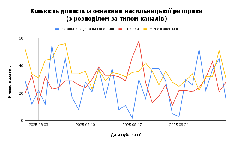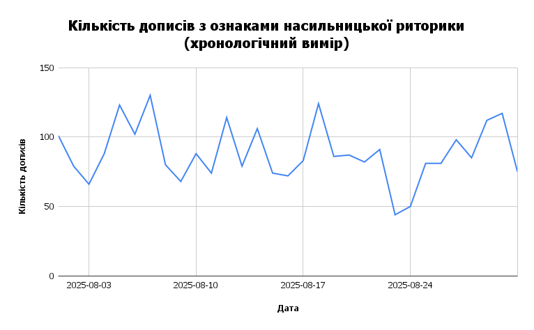 У серпні 2025 року насильницька риторика в досліджуваному масиві даних траплялася нечасто. Серед понад 49 тисяч повідомлень із 67 Telegram-каналів лише 2740 дописів (5,6% від загальної кількості) мали ознаки насильницької риторики. Втім, порівняно з попереднім місяцем, де частка дописів з насильницькою риторикою становила близько 3,6%, помітне незначне зростання. Крім того, на відміну від попереднього місяця, коли більшість дописів із проявами насильницької риторики були сконцентровані навколо протестів щодо НАБУ і САП, цього місяця вони були розподілені більш рівномірно протягом усього часу спостереження.