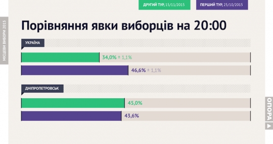 Разом з тим явка на виборах у Дніпропетровську під час другого туру не суттєво зросла: з 43,6% до 45%.