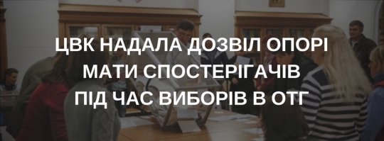 Так, Громадянська мережа ОПОРА 9 вересня подала клопотання на дозвіл мати офіційних спостерігачів під час місцевих виборів. Розглянувши клопотання, ЦВК надала дозвіл мати офіційних спостерігачів під час перших виборів депутатів сільських, селищних, міських рад ОТГ і відповідних сільських, селищних, міських голів 29 жовтня 2017 року.