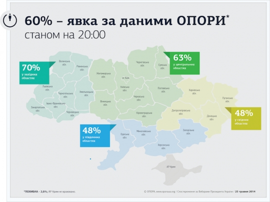 Станом на 20 годину явка на позачергових виборах Президента України по всій Україні складає 60%. Так, зокрема, у Центральних областях (Вінницька, Житомирська, Черкаська, Дніпропетровська, Київська, Кіровоградські області та Київ) явка виборців – 63%, на Заході країни (Львівська, Івано-Франківська, Закарпатська, Тернопільська, Хмельницька, Рівненська, Волинська, Чернівецька) – 70%, а на Сході (Донецька, Харківська, Сумська, Чернігівська, Луганська області) 48% та Півдні (Одеса, Херсон, Миколаїв, Запоріжжя) – по 48%. При цьому враховано похибку – 2,6%.