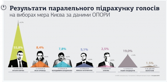 25 травня ОПОРА організувала паралельний підрахунок голосів на основі репрезентативної та статистично обґрунтованої вибірки на виборах міського голови Києва. 500 дільниць стали полем дослідження, результат якого не перевищує похибку на рівні 4,7 %.