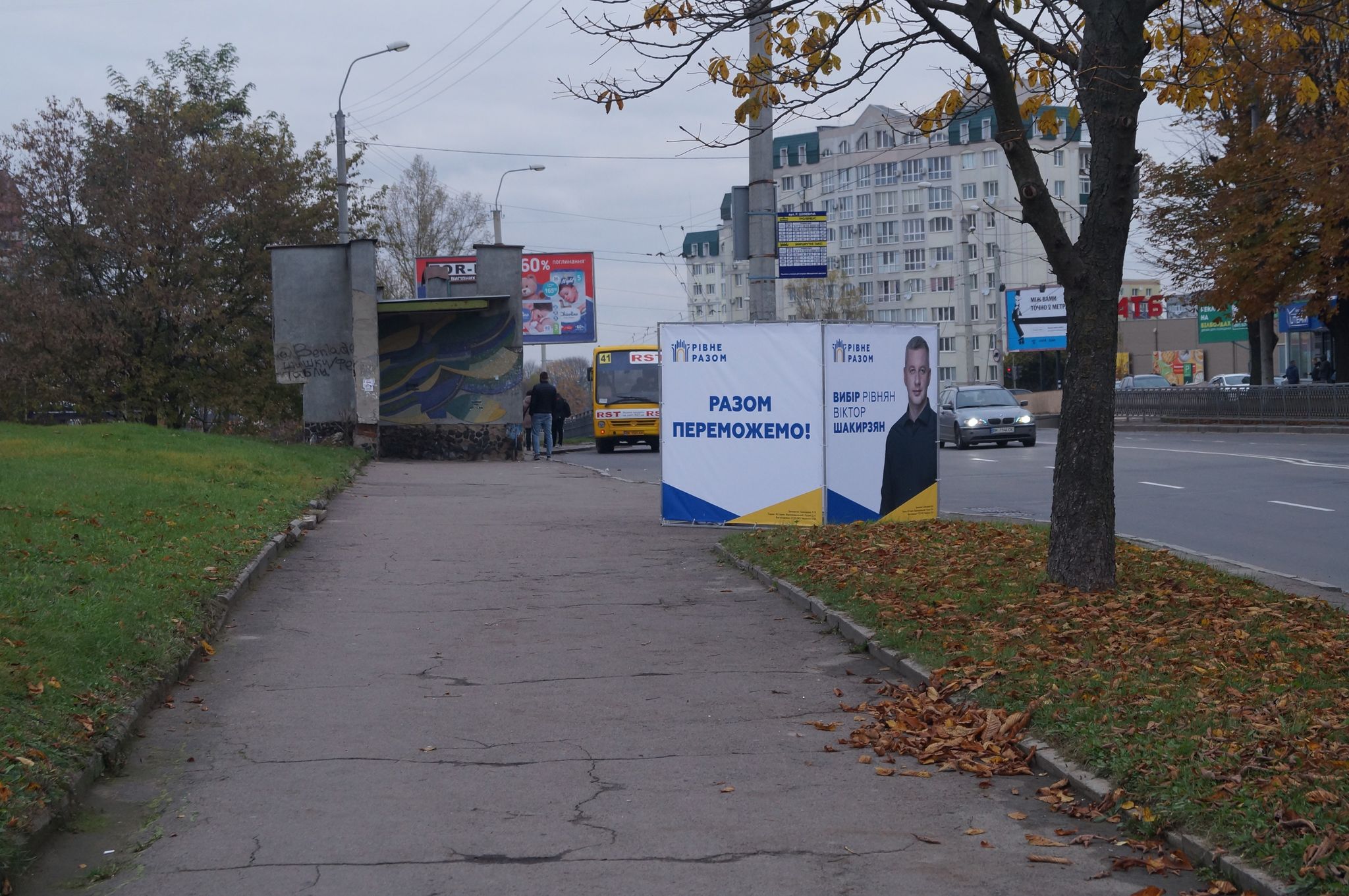 За підрахунками спостерігачів ОПОРИ, майже втричі більше кубів по місту розміщено на підтримку представника партії «Рівне Разом» Віктора Шакирзяна. Такі ж само пропорції і по кількості наметів. Зазначимо, що з наметів Олександра Третяка роздають газету і листівку, а з наметів Віктора Шакирзяна – газету.