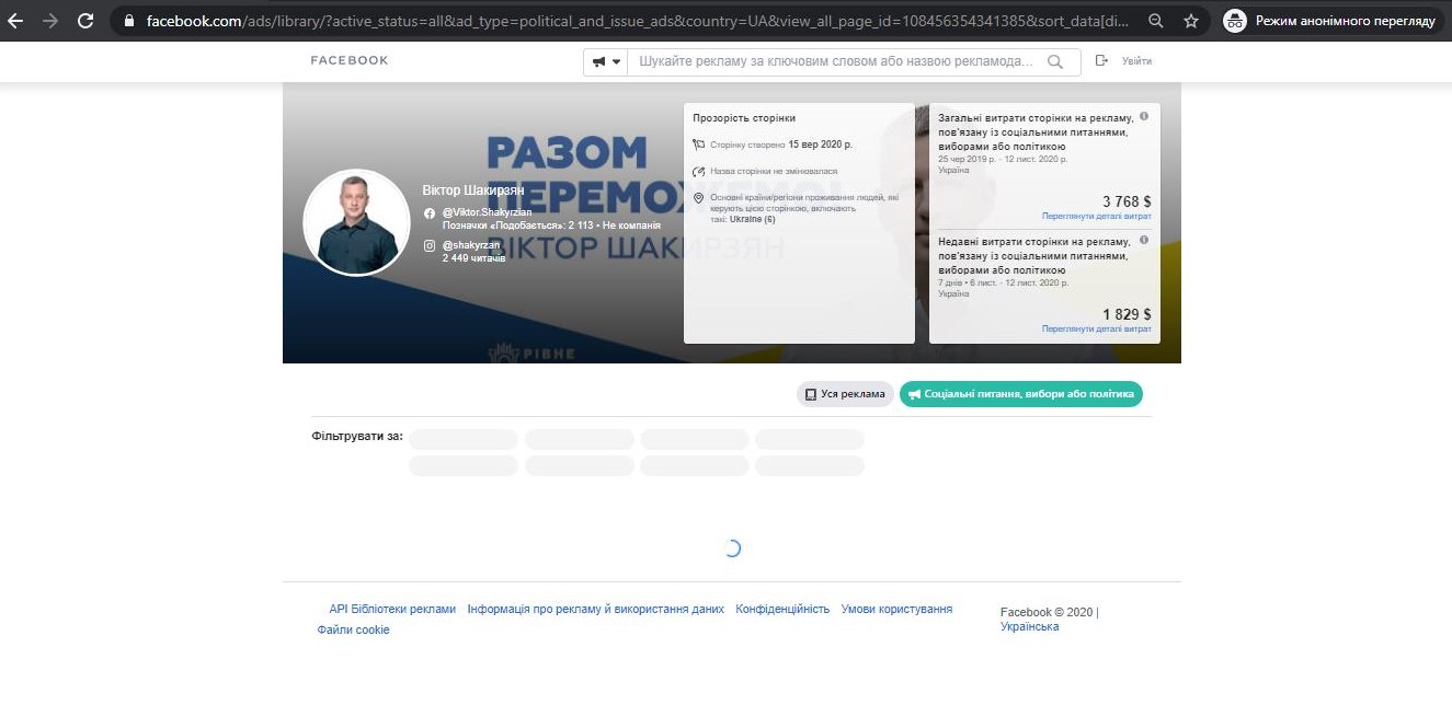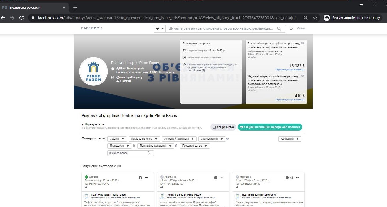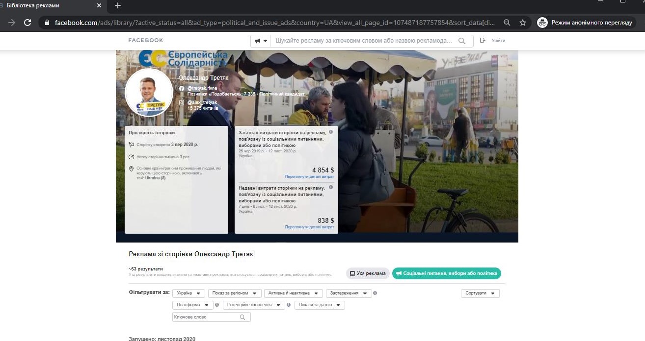 Так, за даними Бібліотеки реклами у Facebook протягом 6 – 12 листопада кандидат на посаду міського голови Рівного від політичної сили «Європейська Солідарність» Олександр Третяк витратив на рекламу, пов’язану із соціальними питаннями або політикою 838$.