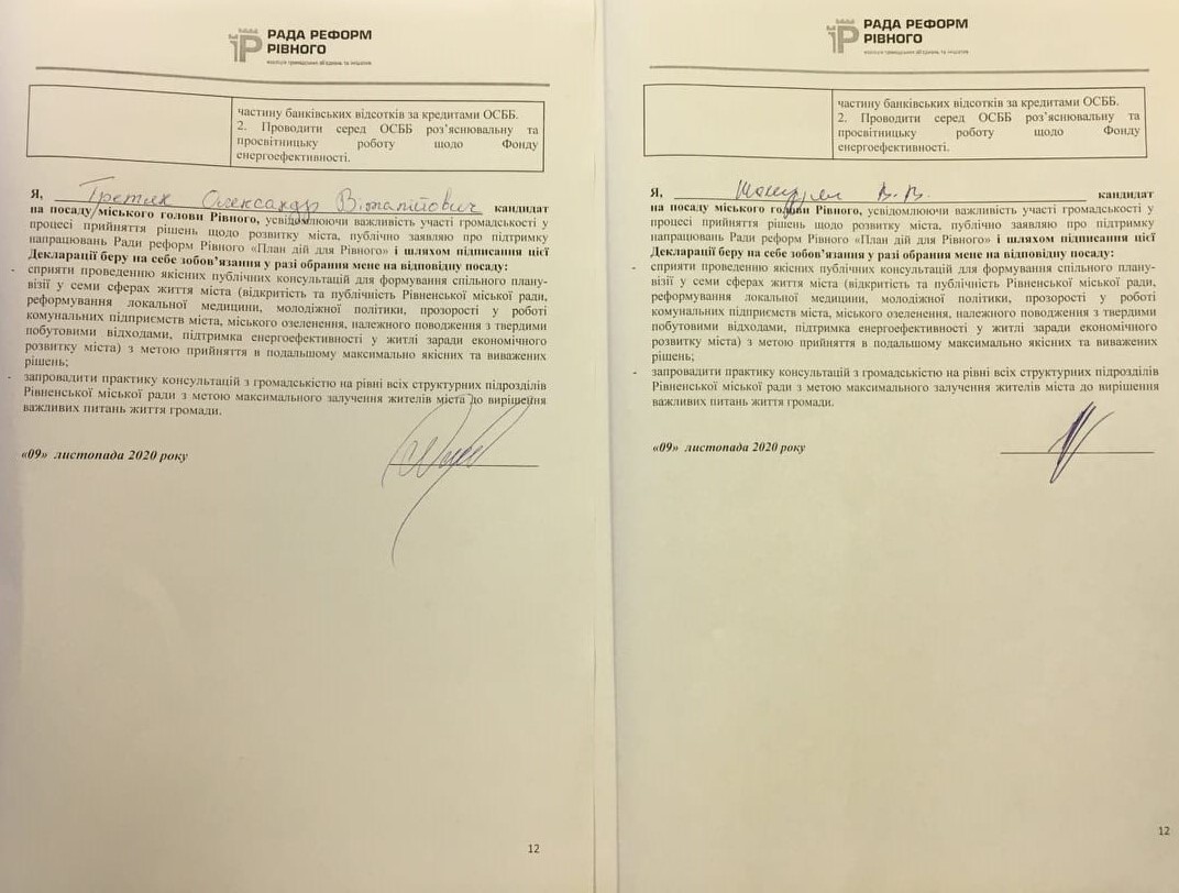 Кандидати на посаду міського голови Рівного двічі зустрічалися під час заходів, організованих місцевою Коаліцією громадських об’єднань та ініціатив Рада реформ Рівного. Перший раз – під час екскурсії на громадську станцію сортування “Екологічні та сміттєвий полігон та вдруге – на презентації напрацювань експертного середовища «План дій для Рівного», яке обидва кандидати підписали.