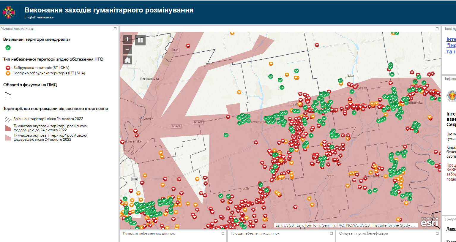 - “Виключена територія” — 56 ділянок загальною площею 1119,65 га, що були вивільнені від вибухонебезпечних предметів.