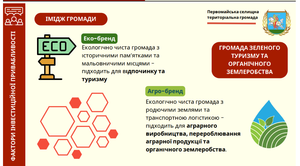 У 2024 році Первома йська військова адміністрація затвердила інвестиційний паспорт громади, який визначає її імідж у двох ключових напрямах: агробренд (“Екологічно чиста громада з родючими землями та транспортною логістикою — підходить для аграрного виробництва, перероблювання аграрної продукції та органічного землеробства”) та екобренд (“Екологічно чиста громада з історичними пам’ятками та мальовничими місцями — підходить для відпочинку та туризму”).