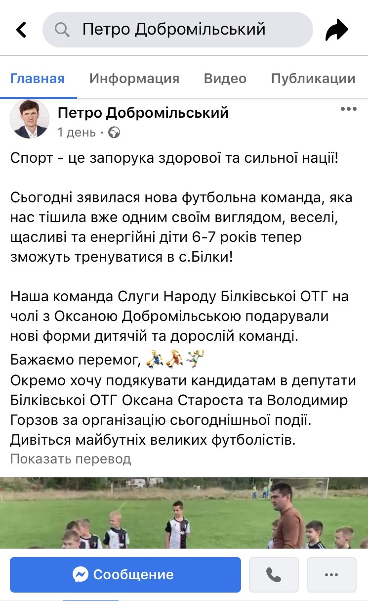 Крім цього, 4 жовтня на сторінці кандидата в депутати Петра Добромільського повідомляється, про подарунок футбольним командам. Як йдеться в дописі, «команда партії «Слуга народу» Білківської ТГ разом із Оксаною Добромільською подарували місцевим дитячій та дорослій командам футбольні форми». Про цей факт спостерігач ОПОРИ повідомив поліцію ввечері 6 жовтня, станом на ранок 7 жовтня допис було видалено.