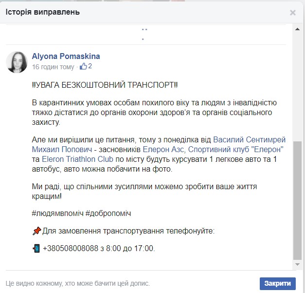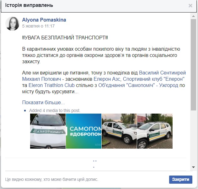 В Ужгороді політична партія «Об’єднання «Самопоміч» анонсувала безкоштовний трансфер для людей з інвалідністю та осіб похилого віку. Про це повідомили у Facebook 5 жовтня на сторінці «Я – «Самопоміч» Ужгород». Як йдеться у дописі, транспорт впровадили спільно з партією «Об’єднання «Самопоміч» через те, що у період карантину особам з інвалідністю та людям похилого віку важко добиратися до органів охорони здоров’я та соціального захисту. Також зазначається, що по місту безкоштовно будуть курсувати одне легкове авто та один автобус, авторка посту вказує й номери телефону, за якими можна замовити трансфер. При цьому оприлюднені на фото автомобілі обклеїні символікою із назвою партії - учасника виборчого процесу.