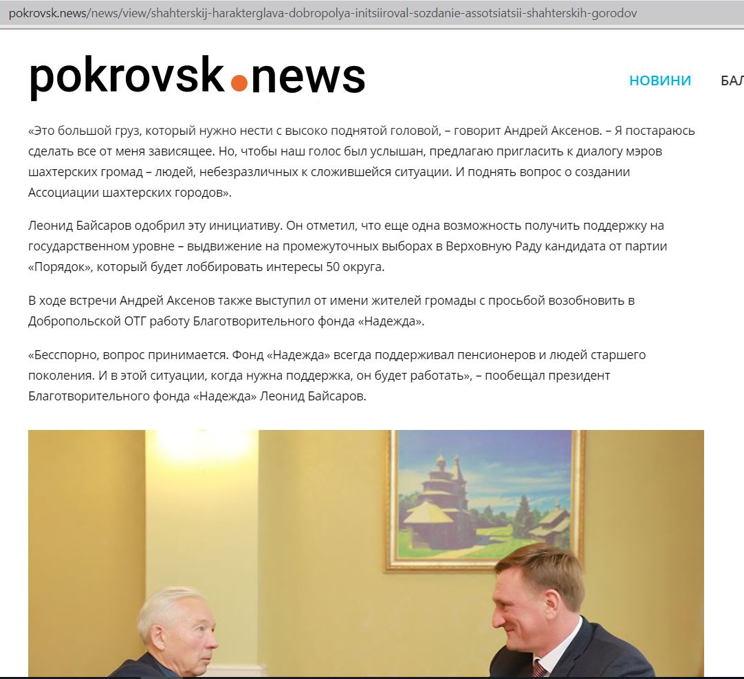 В сюжеті місцевого телеканалу «Капрі» розповіли, що саме завдяки Андрію Аксьонову фонд «Надія» відновив роботу та поновив допомогу літнім людям Покровська, Мирнограду та Добропілля. Директор БФ «Надія» Олена Салія на відео зазначила: «Ми оновили списки, підібрали волонтерів. Ми дійдемо до кожного, надамо допомогу всім нужденним». І додала, що вони вже мають позитивний досвід в реалізації подібної програми.