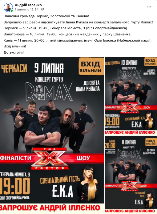 Концерт о 20:00 розпочала співачка EKA. Опісля виступав гурт ROMAX. Артисти неодноразово наголошували, що концерт організований за ініціативи Андрія Іллєнка. Сам він також виступив зі сцени із короткою промовою. “Хочеться щось робити хороше, хочеться допомагати”, – говорив потенційний кандидат. Навпроти сцени стояв агітаційний намет ВО “Свобода”, з якого серед присутніх розповсюджували календарі із логотипом партії, та зображенням Андрія Іллєнка, а також газету із його біографією, значною кількістю фотографій, описом деяких проблем округу та контактами. Захід зібрав із три сотні містян. Завершився він переглядом фіналу чемпіонату Європи з футболу. 10 липня такий самий концерт відбувся у Золотоноші, а 9-го липня – у Черкасах.