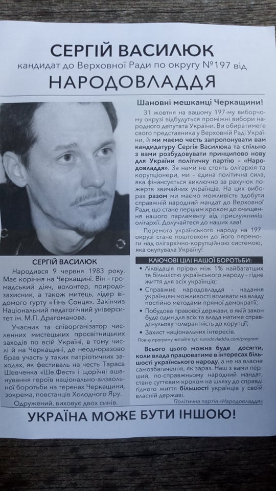 У тиждень із п’ятого по одинадцяте липня на окрузі концертував потенційний кандидат від партії “Народовладдя” Сергій Василюк, відомий тим, що є фронтменом гурту “Тінь Сонця”. Слід зазначити, що в дописах на fecebook-сторінках партії, її очільника, народного депутата попереднього скликання Юрія Левченка Василюка представляють як кандидата, як і на його особистій сторінці. Згідно з законодавством, виборчий процес, а отже й реєстрація кандидатів ще не розпочалися.