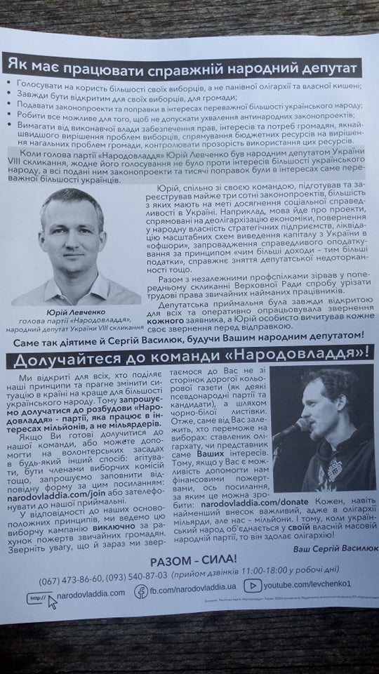 Після однієї із зустрічей у Золотоноші місцева поліція, за словами Юрія Левченка, намагалась скласти адмінпротокол через порушення правил розміщення агітації на що також наразі відсутні правові підстави через те, що офіційно виборчий процес ще не стартував і партія “Народовладдя” та Сергій Василюк офіційно не є його суб’єктами. Листівки, котрі роздавали представники партії “Народовладдя”, містили інформацію про тираж, замовника, установу, що здійснила друк. Однак варто зазначити, що їх виготовлення очевидно профінансоване не з виборчого фонду, позаяк і виборчі фонди ще не відкриті. Юрій Левченко говорить, що такі дії поліції були інспіровані “за вказівкою згори”.