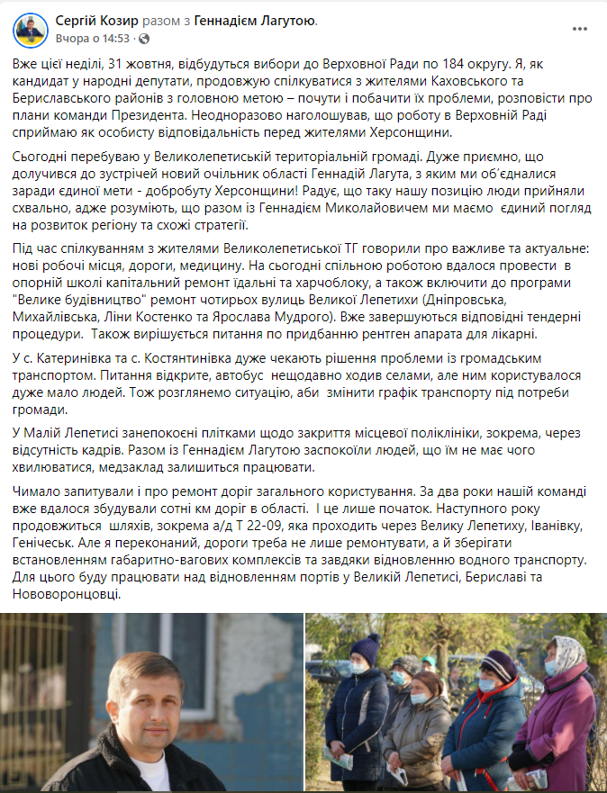 Новопризначений голова Херсонської облдержадміністрації Геннадій Лагута супроводжує кандидата у народні депутати від партії «Слуга народу» Сергія Козиря. Про це на своїй сторінці у Facebook пише сам Сергій Козир, а також зафіксували спостерігачі ОПОРИ.