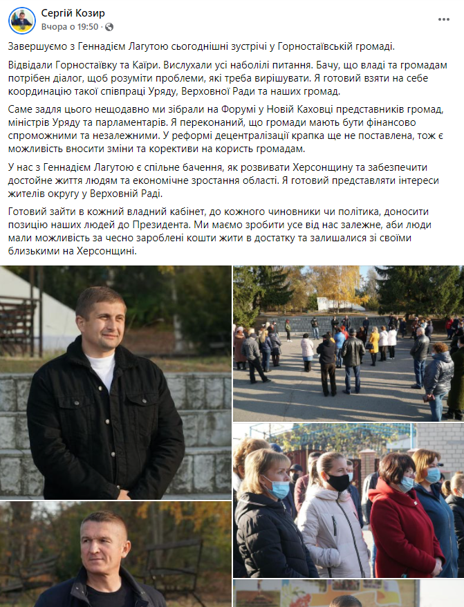 В цей же день Лагута та Козир провели зустрічі у Горностаївській громаді, де Козир згадав Форум у Новій Каховці за участі міністрів, народних депутатів та представників громад. Тоді, до слова, на заході звучала агітація на користь Козиря.