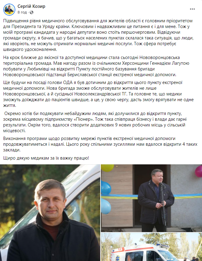 29 жовтня Геннадій Лагута та Сергій Козир разом були на відкритті Пункту постійного базування бригади Нововоронцовської підстанції Бериславської станції екстреної медичної допомоги. Козир нагадав, що, будучи головою Херсонської ОДА, він був дотичним до відкриття цього пункту екстреної медичної допомоги.