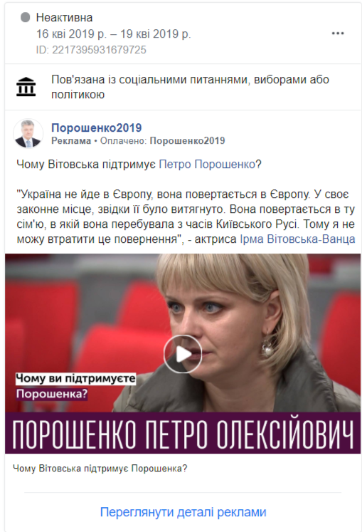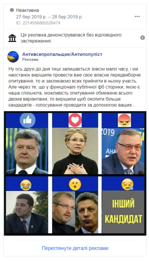 Приклад політичної реклами зі сторінки “Гібридна політика” без дисклеймера — тобто без жодної інформації про замовника