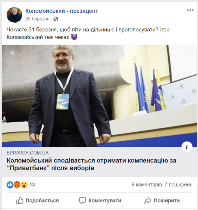 3. До групи “АнтиКоломойський” ми відносимо чотири сторінки, що особливо вирізняються серед інших своєю тематикою: основою своєї інформаційної кампанії вони обрали висвітлення небезпеки допущення олігарха Ігоря Коломойського до влади. Для досягнення цієї мети вони однаковою мірою вдавалися до дискредитації як Володимира Зеленського, так і Юлії Тимошенко, при цьому практично всі агітували за Петра Порошенка. Цікаво, що більша частина сторінок була створена майже перед стартом виборчої кампанії, або вже під час неї: “Шостий” – в грудні 2018, а “Коломойський – президент” та “Бенина кофейня” – у січні 2019 року. Вирізняється з-поміж них лише сторінка “Собака Путина”, яка була створена ще у вересні 2013 року (тоді дискредитувала лише Юлію Тимошенко, а в рамках цьогорічної президентської кампанії значну увагу приділяла також і Володимиру Зеленському).