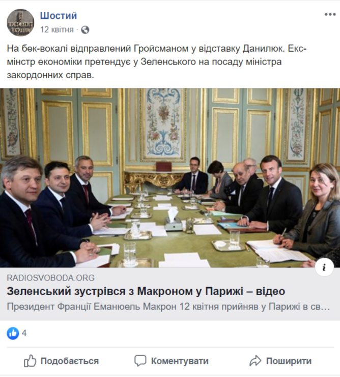 2. Сторінки, що агітували за кандидатів, насамперед, за Володимира Зеленського, також вдавалися до тактики дискредитації Петра Порошенка. Це сторінки: “За Зеленського”, “Президент України 2019” і “Змінимо країну РАЗОМ”. Їхня аудиторія була середнього розміру і складала близько 100,000-400,000 підписників. Всі три були створені взимку 2018/2019 року вочевидь для ведення передвиборчої кампанії Володимира Зеленського і видалені після обрання останнього Президентом України (окрім “Змінимо країну РАЗОМ”, яка існує і дотепер). Обсяги агітації за Володимира Зеленського зазвичай на цих сторінках значно перевищують обсяги дискредитації Петра Порошенка. Наприклад, співвідношення кількості постів за досліджуваний період на сторінці “Змінимо країну РАЗОМ” — 74 % до 17 %. Так само, як і у випадку з клікбейтними “медіа”, ми нічого не знаємо ні про дописувачів цих сторінок, ані про можливе фінансування їхньої активності.