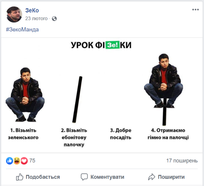 Окрім того, серед політичної агітації у Facebook помітно переважали матеріали, які “тиснули” на страхи та негативні емоції виборців щодо фаворитів кампанії та їхніх прихильників. Дуже часто агітація була не за, а проти кандидатів. Зокрема було створено низку сторінок з метою дискредитації як Петра Порошенка, так і Володимира Зеленського.