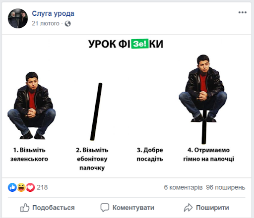 4. Група “мем-генераторів” включає п’ять сторінок, а її особливістю є спосіб подання інформації: дописи сторінок цієї групи практично не містять тексту (в середньому – 8,6 слів на 1 пост), в той час як основним способом донесення інформації до підписників є фото (в середньому 1168 фото на сторінку) та відео (137 відео на сторінку). Переважна більшість дописів – це кумедні зображення Володимира Зеленського та демонстрація його нібито незграбності, недосвідченості та залежності від Ігоря Коломойського.