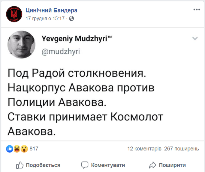 2. Значно більш цікавою та важливою для аналізу є так звана група “Дмитрівська, 80”. Її умовна назва походить від київської адреси, зазначеної у дисклеймері кожного рекламного допису, які були розміщені на всіх сторінках у цій групі. “Zelenka”, “Жовта стрічка”, “Зрада/Перемога”, “Порошенко2019”, “Міністерство бариг”, “Цинічний Бандера” та “Бойкот Партии Регионов” – рекламу на всіх цих сторінках, згідно з інформацією, що надає бібліотека політичної реклами Facebook (у тому числі й адресу та мобільний номер замовників), розміщувала одна й та ж юридична особа. Прикметним також є той факт, що замовниками реклами зазначені власне сторінки у Facebook, а не фізичні чи юридичні особи. Одним із аргументів зв’язку зазначених сторінок може бути й нинішня їхня активність: зокрема 17 грудня 2019 року на сторінках “Цинічний Бандера” та “Бойкот Партии Регионов” з різницею в 1 хвилину було опубліковано однакові дописи.
