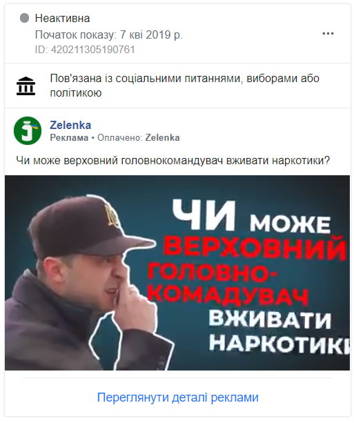 Політична реклама з дискредитацією Володимира Зеленського демонструвалась лише на двох сторінках з п’яти – “Бенин клоун” та “Слуга урода”. При цьому важливо зазначити, що реклама була різною, та на обох сторінках демонструвалась без відповідного застереження, тому її походження визначити неможливо.