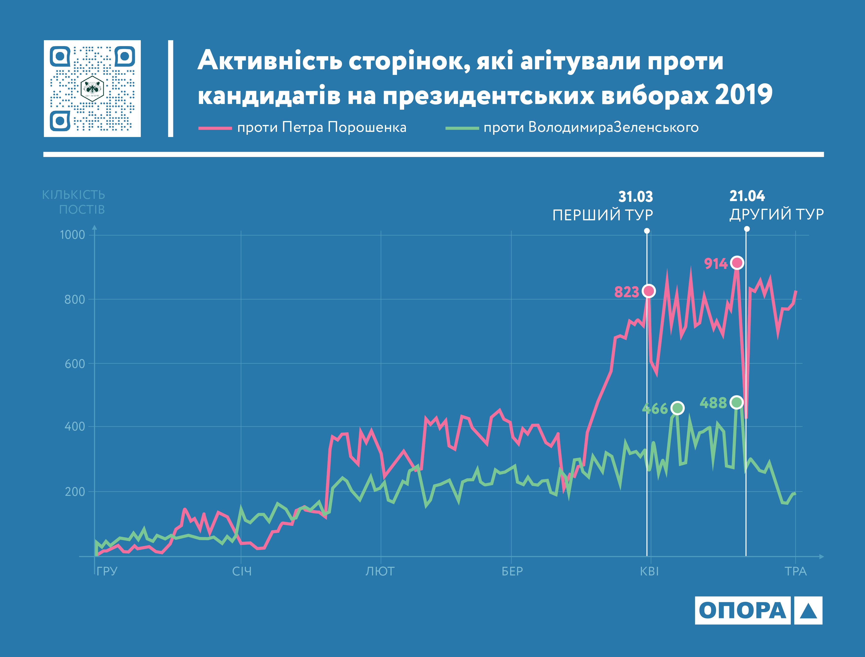 Після опрацювання даних ОПОРА отримала результати, які показують значне зростання активності сторінок, що дискредитували фаворитів президентської кампанії, напередодні дня голосування в обох турах виборів. До прикладу, активність сторінок, що дискредитували Петра Порошенка зростала з 20 дописів на день перед початком кампанії до максимальних 914 дописів на день напередодні голосування в другому турі виборів.