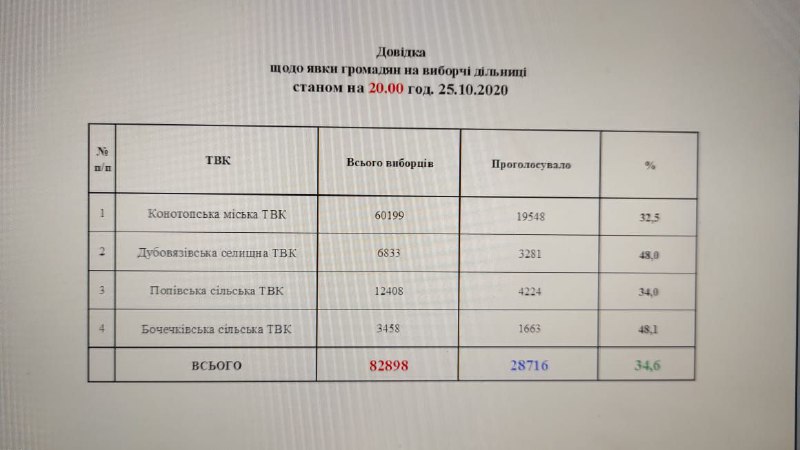 Зокрема, територіальна виборча комісія міста Шостки повідомляє, що із загальної кількості в 70890 виборців проголосувало лише 21402 особи. Це означає, що явка на вибори склала 30,18%.