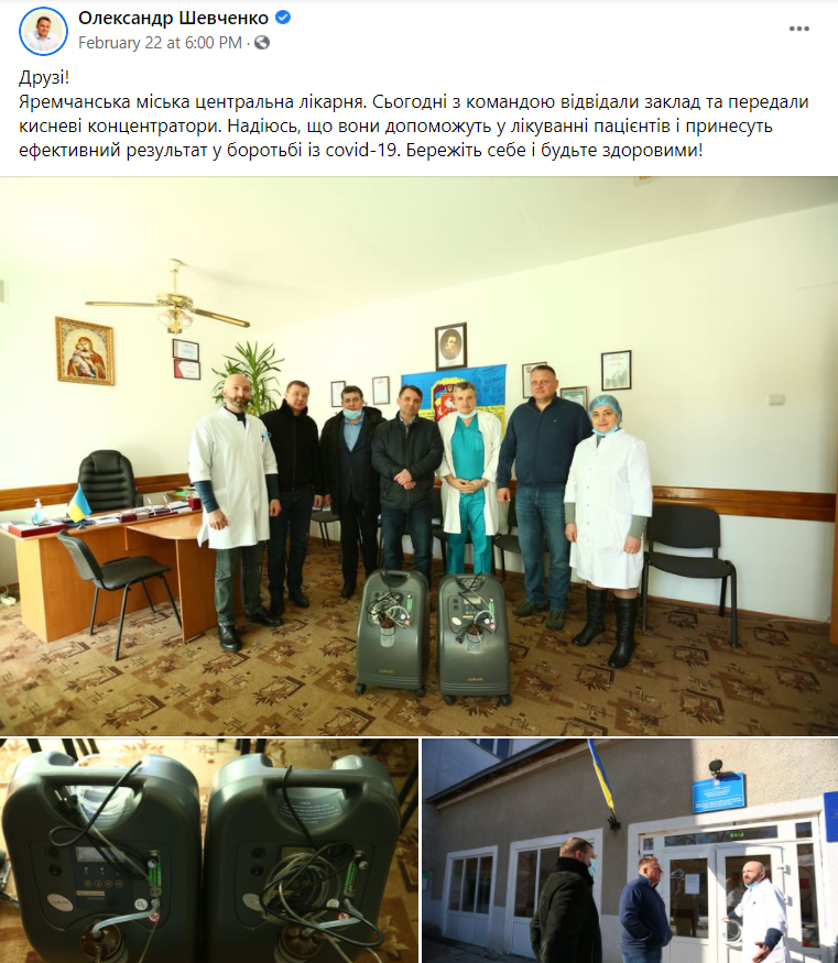 Кандидат у народні депутати на проміжних виборах у окрузі №87 від партії “За майбутнє” Олександр Шевченко на своїй верифікованій сторінці у Facebook повідомляє про передачу кисневих концентраторів лікувальним закладам, які знаходяться на території виборчого округу. Також про передачу апарату штучної вентиляції легень інформує кандидат від ВО “Свобода” Руслан Кошулинський.
