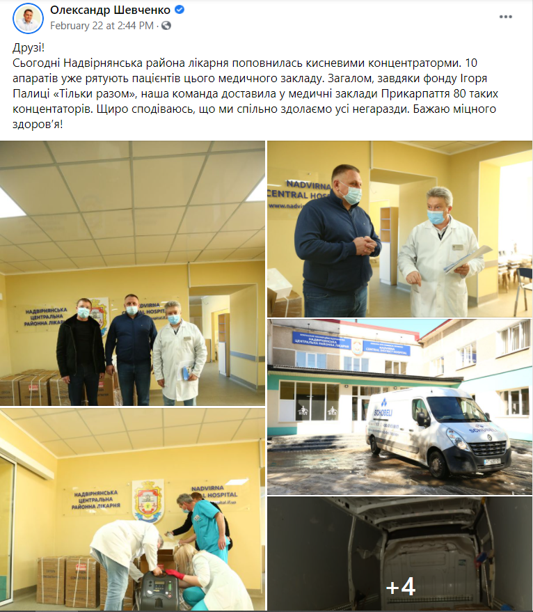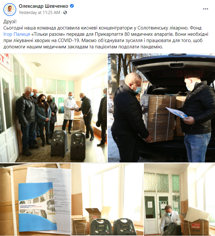 У відеороликах про передачу концентраторів Олександра Шевченка позиціонують як депутата Івано-Франківської обласної ради, а медичне обладнання передається від імені благодійного фонду лідера партії “За майбутнє” «Фонду Ігоря Палиці «Тільки разом», який є однопартійцем Шевченка.
