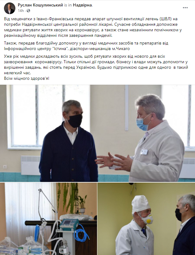 Крім того, сторінка кандидата у народні депутати Руслана Кошулинського повідомляє про передачу апарату штучної вентиляції легень від меценатки з Івано-Франківська на потреби Надвірнянської центральної районної лікарні та медичних засобів та препаратів від Інформаційного центру "Істина", діаспори-мешканців м.Чикаго.