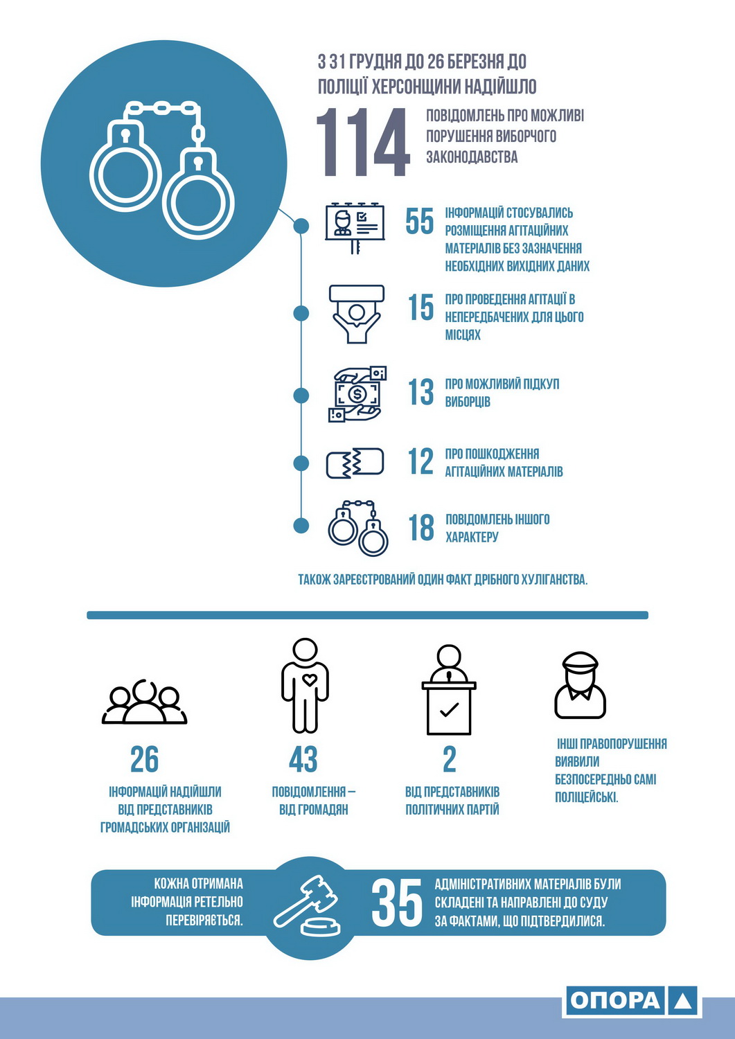 Як розповіла комунікаційниця Громадянської мережі ОПОРА, з 31 грудня до 26 березня до поліції Херсонщини надійшло 114 повідомлень про можливі порушення виборчого законодавства. Із них 55 стосувались розміщення агітаційних матеріалів без зазначення необхідних вихідних даних, 15 – про проведення агітації в непередбачених для цього місцях, 13 – про можливий підкуп виборців, 12 – про пошкодження агітаційних матеріалів та 18 повідомлень іншого характеру. Також зареєстрований один факт дрібного хуліганства. 26 повідомлень надійшли від представників громадських організацій, 43 повідомлення – від громадян, 2 – від представників політичних партій. Інші правопорушення виявили безпосередньо самі поліцейські. Кожна отримана інформація ретельно перевіряється. За фактами, що підтвердилися, були складені та направлені до суду 35 адміністративних матеріалів.