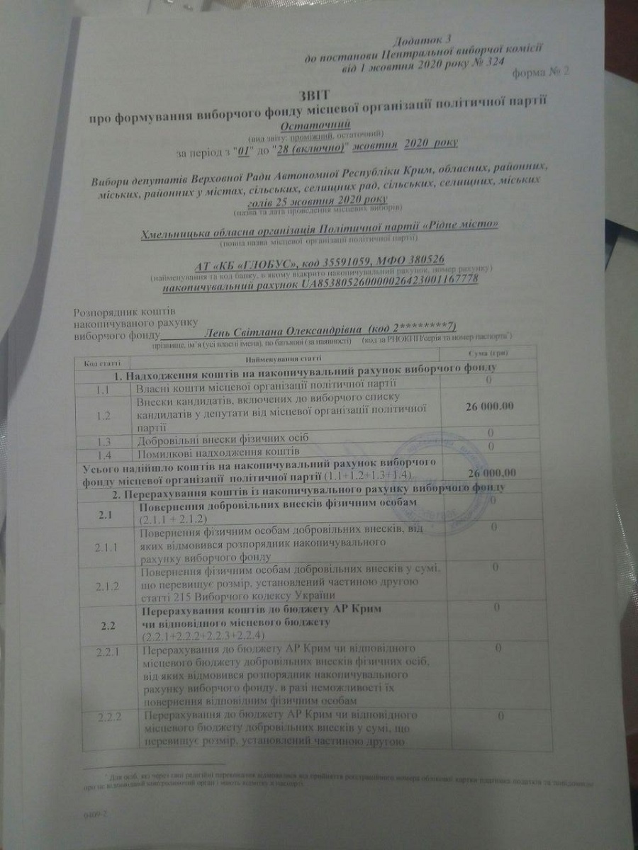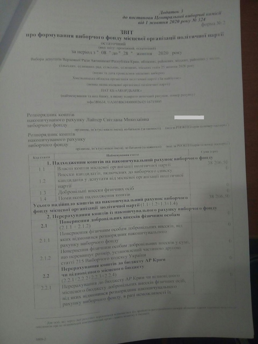 Виборче законодавство вимагає, щоб не пізніш як на сьомий день після дня голосування розпорядник коштів накопичувального рахунку виборчого фонду організації партії, також розпорядник поточного рахунку виборчого фонду кандидата у депутати, кандидата на посаду сільського, селищного, міського голови подали до відповідної територіальної виборчої комісії остаточні фінансовий звіти за формою, встановленою Центральною виборчою комісією. Тобто остаточні фінансові звіти партій і кандидатів, які балотувалися на місцевих виборах 25 жовтня, ТВК мали отримати до 1 листопада 2020 р.