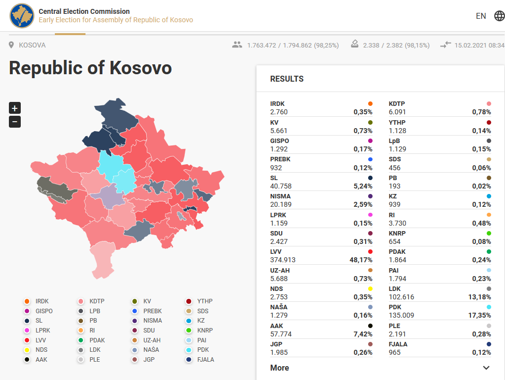 Лідирує зі значним відривом партія "Самовизначення" (Vetevendosje) – майже48 % підтримки виборців. Однак цього недостатньо, щоб мати більшість. Тож партії доведеться шукати партнера та укладати коаліційну угоду. Зокрема, для того щоб затвердити уряд.