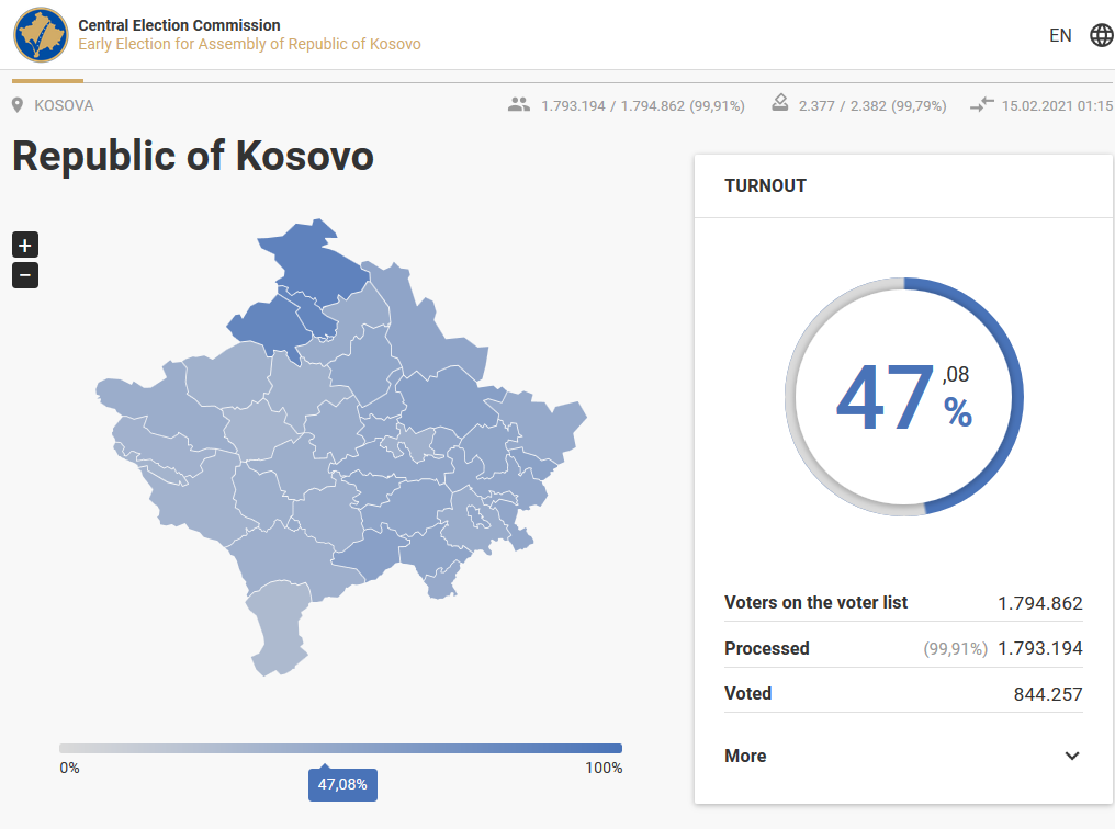 У неділю, 14 лютого, новий парламент обирали громадяни частково визнаної Республіки Косово. З 1,8 млн осіб, які могли взяти участь в голосуванні, виборчі дільниці відвідали 844 257 виборців.