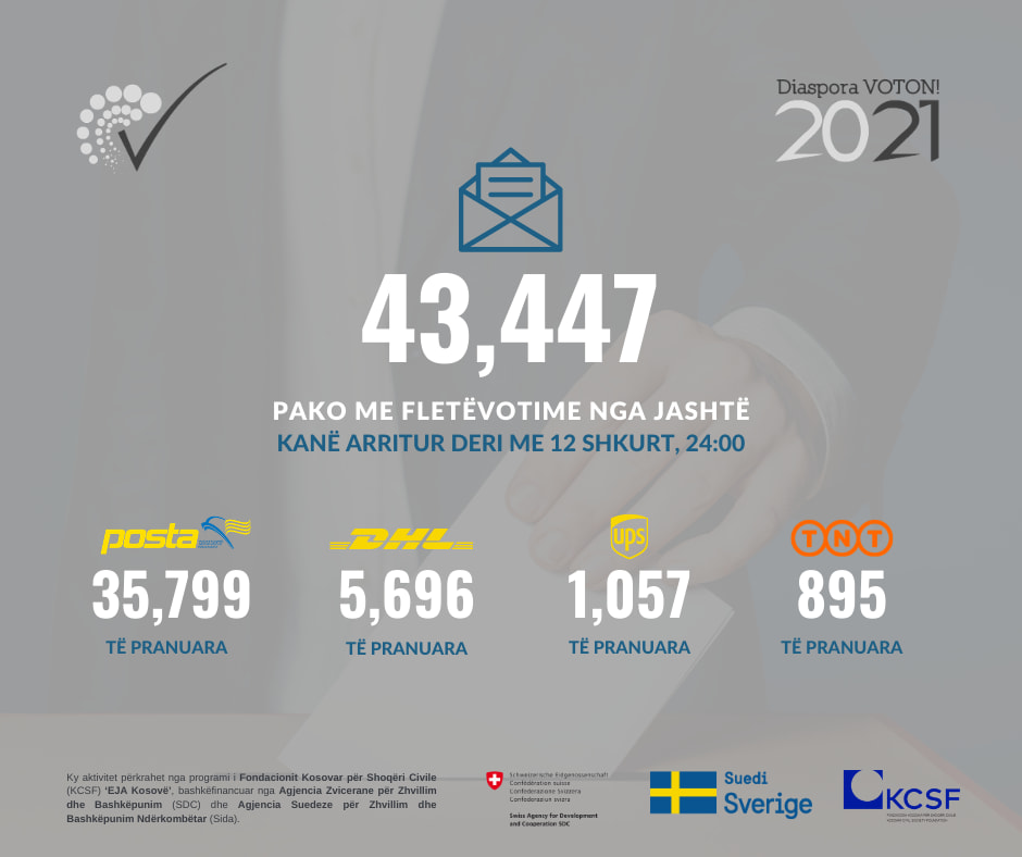 Громадяни Косова, які проживають поза межами країни, голосували поштою. Як повідомляє неурядова організація “GERMIN”, Центральна виборча комісія отримала майже 43,5 тис. пакетів з бюлетенями, які надійшли різними службами доставки. Нагадаємо, що цього року ЦВК запровадила перевірку заявок виборців з діаспори за допомогою телефонних дзвінків. Якщо заявник не відповів після трьох дзвінків, заявка була відхилена.