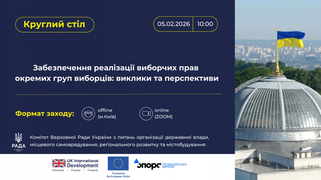 Громадянська мережа ОПОРА запрошує на круглий стіл “Забезпечення реалізації виборчих прав окремих груп виборців: виклики і перспективи”, який відбудеться 5 лютого 2026 року в Києві з 10:00 до 14:00. Захід запланований у змішаному форматі з можливістю як особистої, так і онлайн-участі.