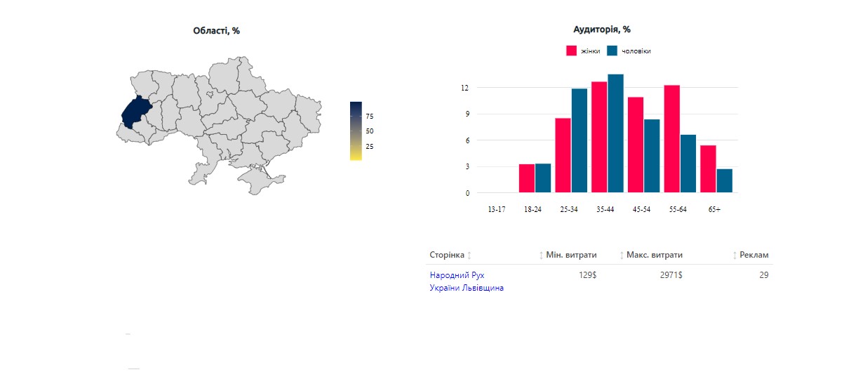 Декілька постів на сторінці “Народний Рух України Львівщина” оплачував ФОП Пустовіт. Він у фінансовому звіті політичної сили вказаний. Однак більшість дописів оплачували заступник голови міської організації Тарас Левицький та сама партія. Зрозуміти, чи ці витрати записані у документі, неможливо. За поданий період фінансового звіту зі сторінки політичної сили у соціальних медіа рекламувалося 29 дописів на суму орієнтовно від 129 до 2 971 доларів.