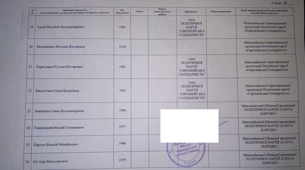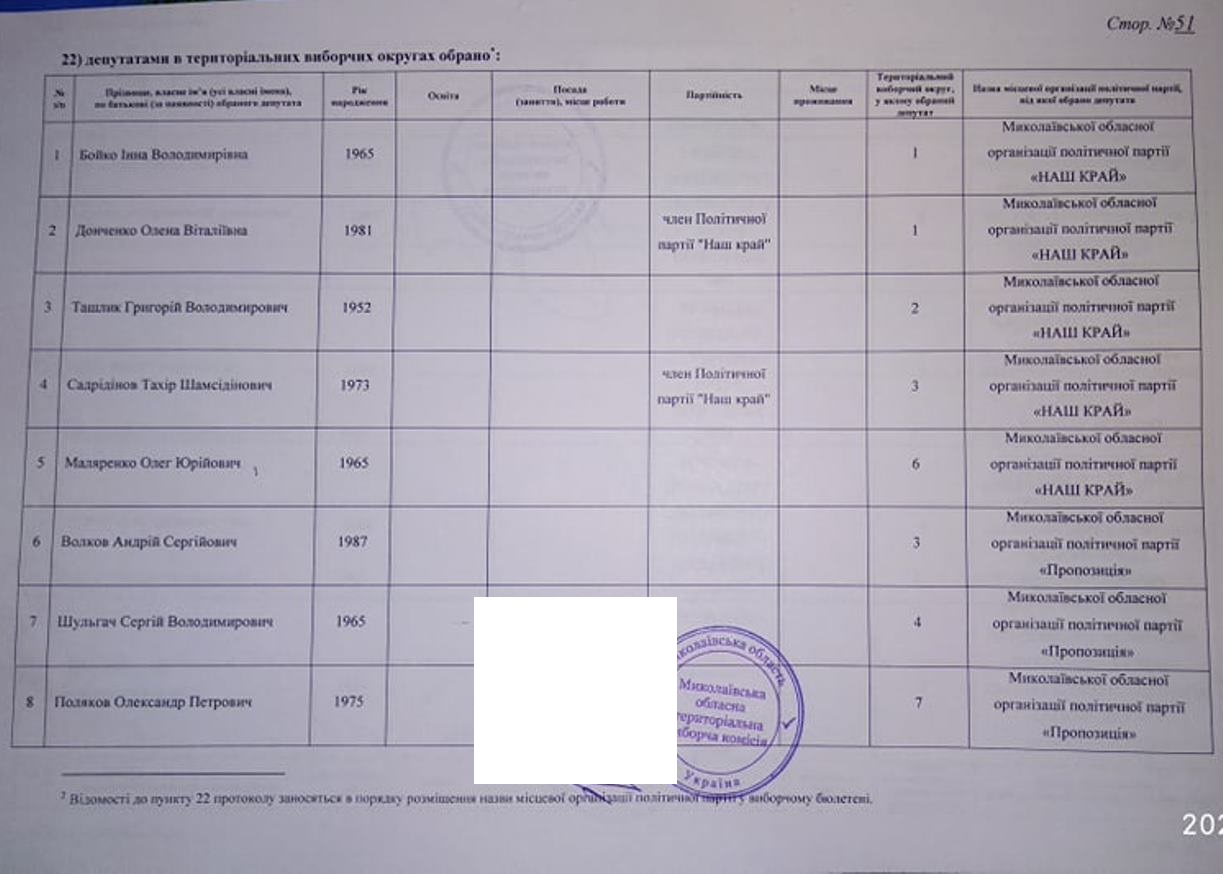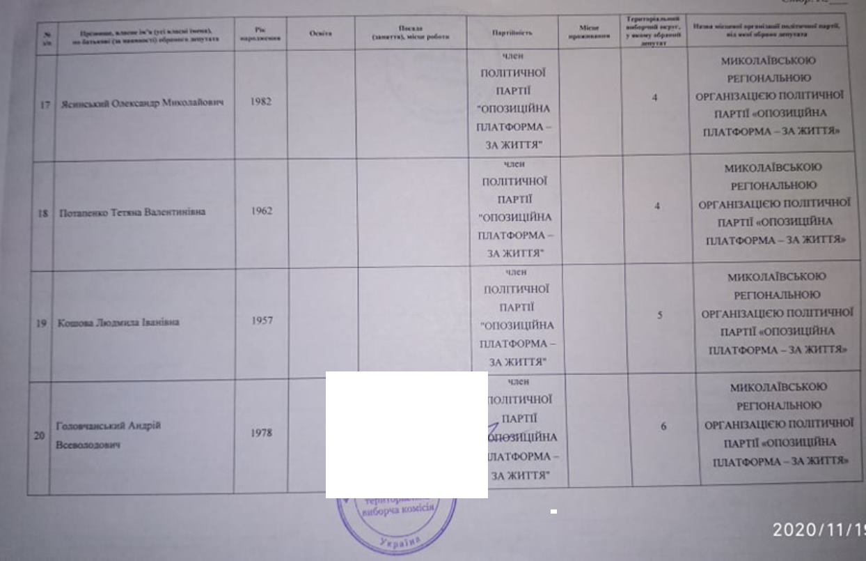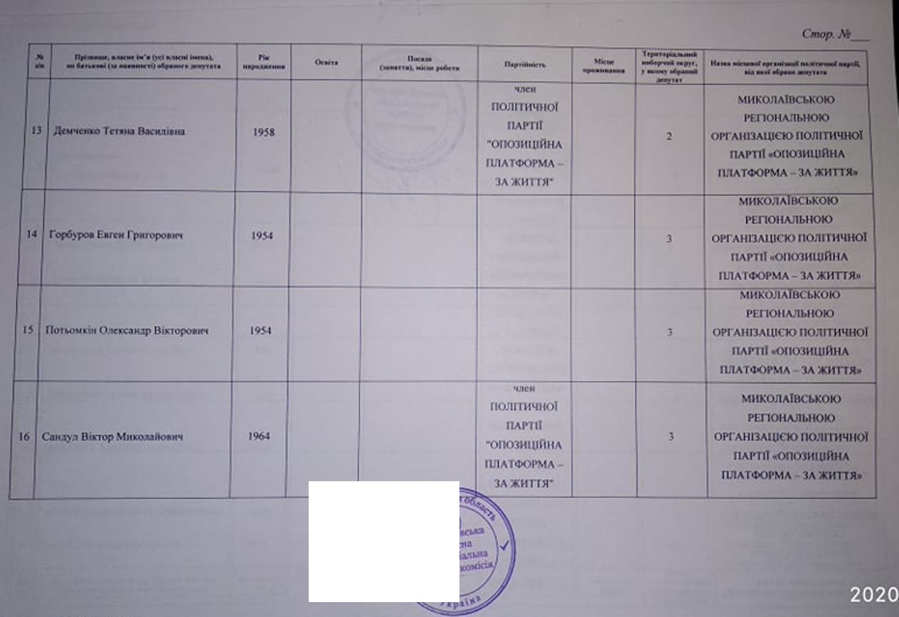 Тож за даними протоколу Миколаївської обласної територіальної виборчої комісії від місцевого осередку партії «ОПЗЖ» у територіальних виборчих округах депутатами обласної ради обрані: