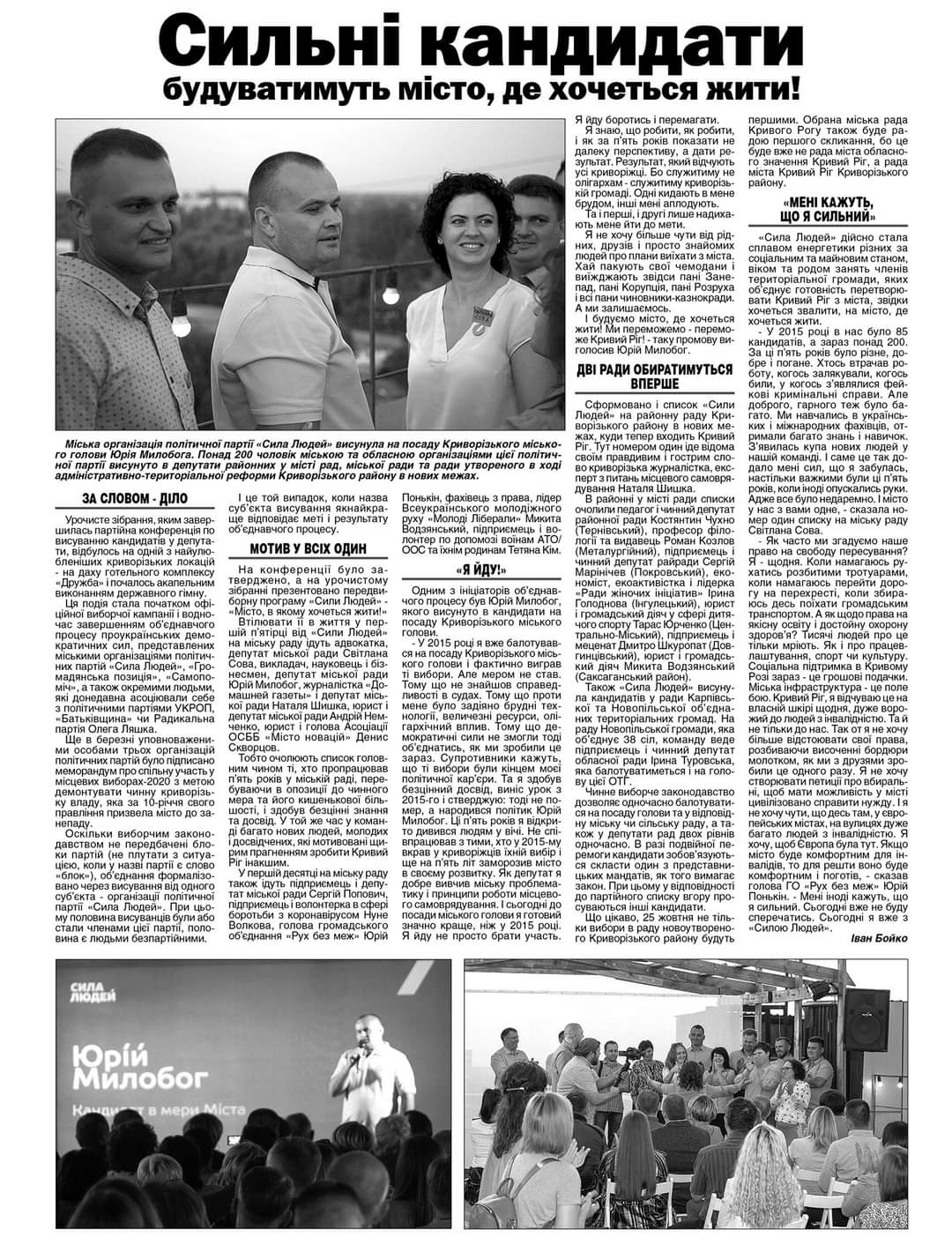 В Криворізькій газеті «Домашняя газета» 23 вересня зафіксований матеріал під назвою «Сильні кандидати будуватимуть місто, де хочеться жити». В публікації наводяться списки кандидатів у депутати від партії «Сила людей», багато цитат кандидата на посаду міського голови Кривого Рогу Юрія Милобога – «Сила людей дійсно стала сплавом енергетики різних за соціальним та майновим станом, віком та родом занять членів територіальної громади…». Публікація не маркована як політична реклама.
