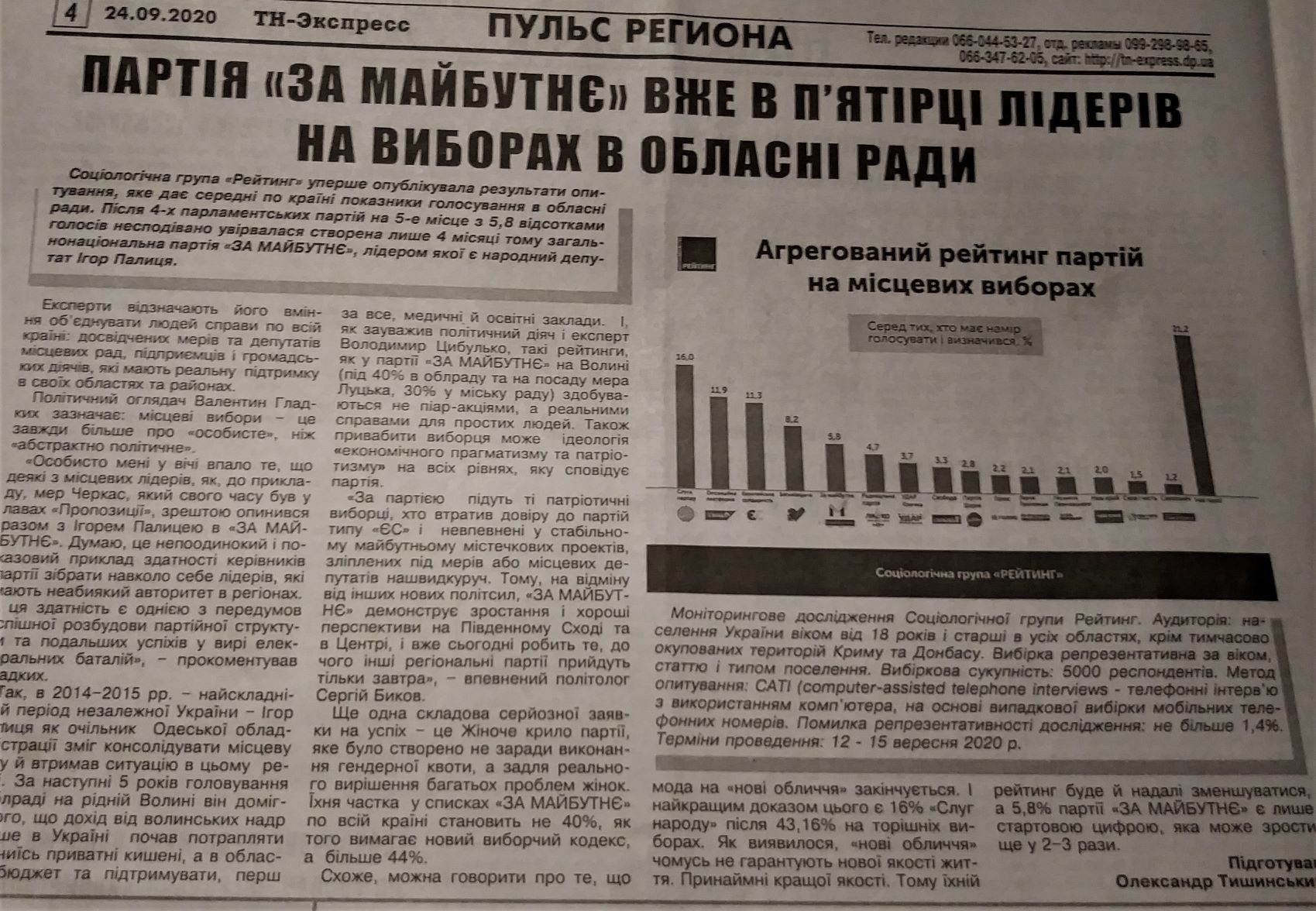 В іншій немаркованій публікації під назвою «Партія «За майбутнє» вже в п’ятірці лідерів на виборах в обласні ради» йдеться про опутування соціологічної групи «Рейтинг», яке проводилось в усіх областях України 12 – 15 вересня. В матеріалі наводяться цитати політичних експертів Володимира Цибулька та Сергія Бикова, які роблять акцент лише на показниках партії «Україна майбутнього».