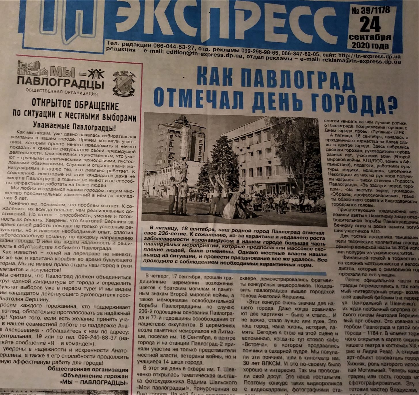 24 вересня в газеті «ТН - експрес» зафіксовано три матеріали без маркування. На першій шпальті опубліковано відкритий лист ГО «Объединение горожан. Мы - Павлоградцы», в якому активісти закликають голосувати за чинного міського голову м. Павлоград Анатолія Вершину з цитатою: «Ми вважаємо, що Павлоград повинен об’єднатися навколо єдиної кандидатури від міста та визначити результати виборів вже в першому турі! І ми бачимо таким кандидатом чинного керівника міста Анатолія Вершину…».