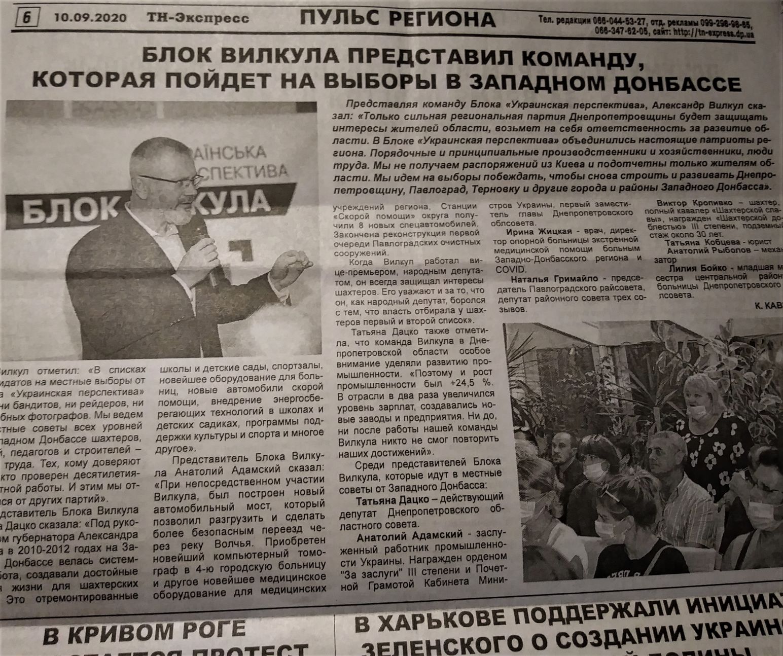 Немаркований як політична реклама матеріал зафіксовано у Павлоградській місцевій газеті «ТН – експрес» від 10 вересня. Одна з публікацій має такий заголовок - «Блок Вілкула представив команду, яка піде на вибори в Західному Донбасі». В тексті матеріалу наведені цитати представників партії. Так, Олександр Вілкул сказав: «Тільки сильна регіональна партія Дніпропетровщини буде захищати інтереси жителів області, візьме на себе відповідальність за розвиток області...», Тетяна Дацко зазначила: «Под руководством губернатора Александра Вілкула в 2010 – 2019 годах на Западном Донбассе велась системная работа…», Анатолій Адамський додав: «При непосредственном участии Вилкула біл построен новій автомобильный мост…».