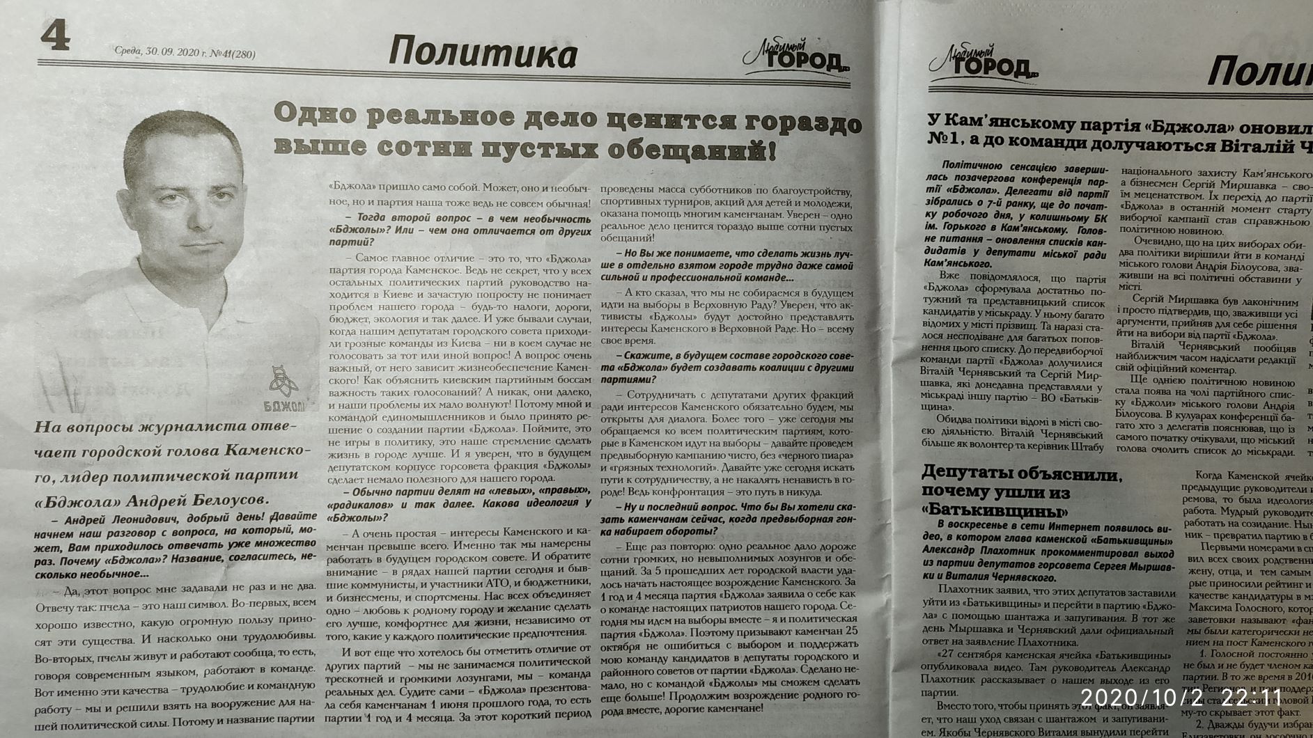 В газеті міста Кам’янське «Любимый город» від 30 вересня опубліковано інтерв’ю з міським головою Кам’янського Андрієм Білоусовим. В матеріалі під назвою «Одно реальное дело ценится гораздо выше сотни пустых обещаний» розповідається про діяльність партії «Бджола», лунають заклики проголосувати за кандидатів від партії на виборах. Журналіст ставить лише зручні питання, інтерв’ю вийшло повністю компліментарним щодо міського голови. Цей матеріал не маркований як політична реклама .