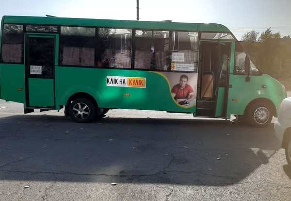 Також у м. Костянтинівці по вул. Олекси Тихого на зупинці громадського транспорту "Міська рада" зафіксовані маршрутки, на яких розміщено наліпки на користь кандидата на посаду голови Костянтинівської ТГ Олександра Куліка із зображенням самого кандидата та написом "Клік на Кулік".