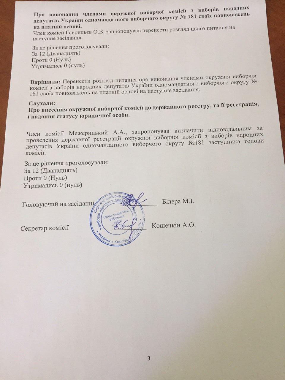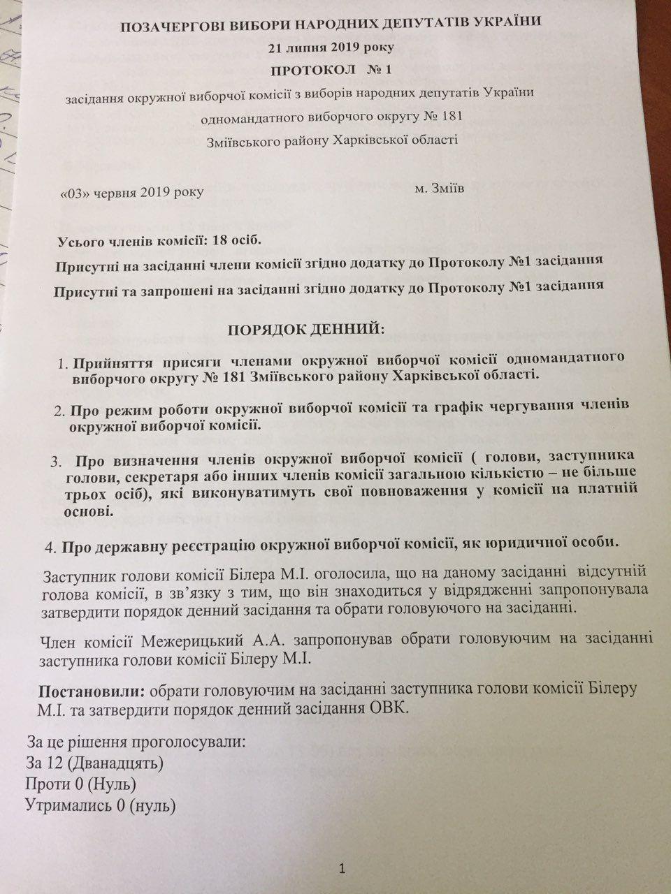 3 червня, відповідно до закону, окружна виборча комісія № 181 провела своє перше засідання, на якому були присутні 12 з 18 членів ОВК. Вони прийняли присягу, визначили час роботи, графік чергування і вирішили питання про реєстрацію комісії як юридичної особи.