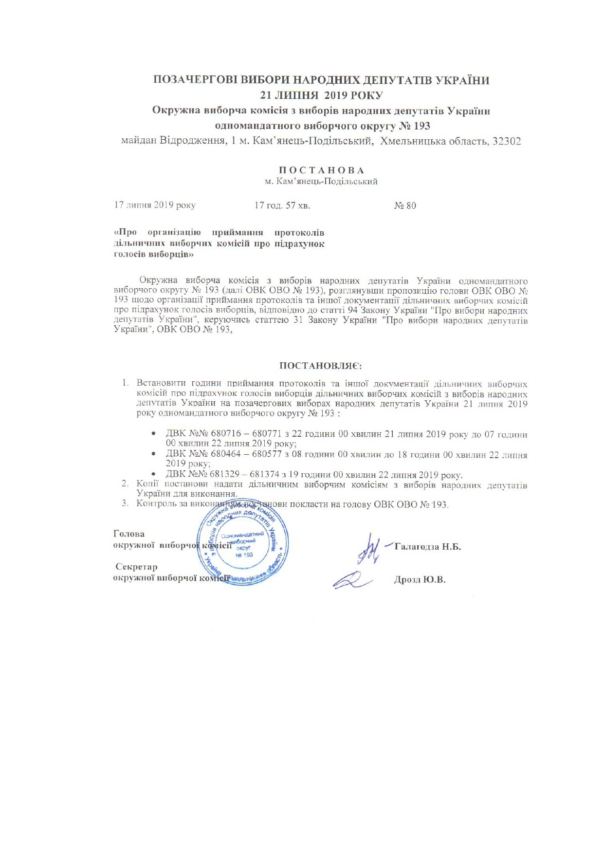 ОВК виборчого округу №193, розглянувши пропозицію голови комісії, своєю постановою від 17 липня 2019 року №80 затвердила графік приймання протоколів дільничних виборчих комісій про підрахунок голосів виборців.